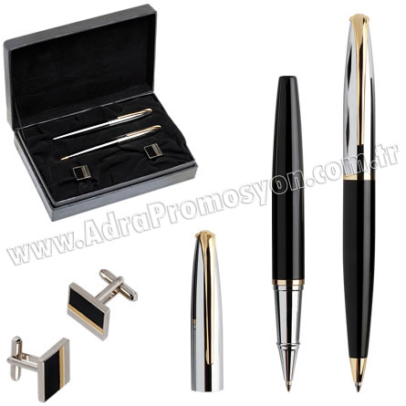 Set; tükenmez kalem, roller kalem ve kol düğmelerinden oluşmaktadır |